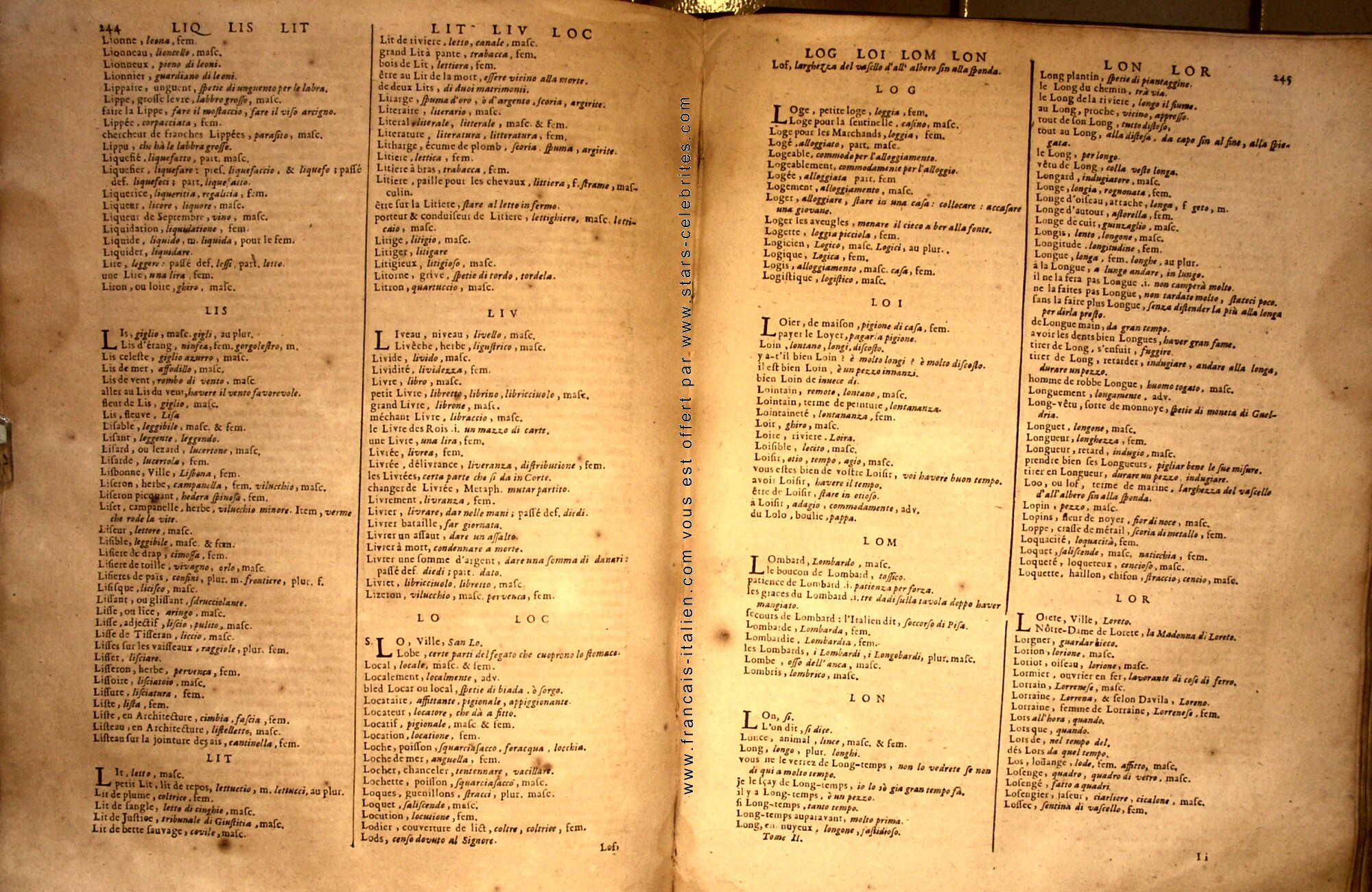 Nous vous proposons sur ce site, la version entièrement numérisée du dictionnaire Italien Français (Tome 1) et Français Italien (Tome 2) de VENERONI édité pour la première fois à Paris en 1681. Les photos sont de qualité suffisante pour permettre une lecture en ligne, cependant et pour vous faciliter l'usage de ce document exceptionnel, nous vous proposons de télécharger l'intégralité du dictionnaire afin de le conserver sur le support de votre choix. L'usage de la version numérisée de ce dictionnaire et libre et gratuite, à condition de ne pas supprimer la mention "www.francais-italien.com vous est offert par www.stars-celebrites.com" portée sur chaque double page, sans oublier de préciser l'auteur de ce dictionnaire : le Sieur Veneroni.